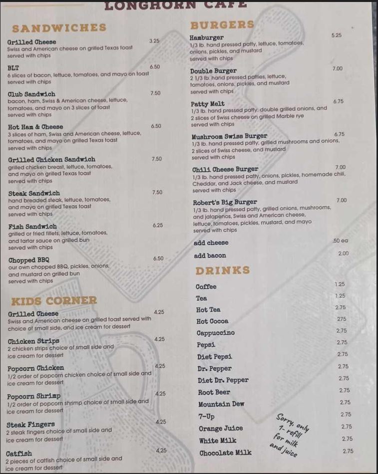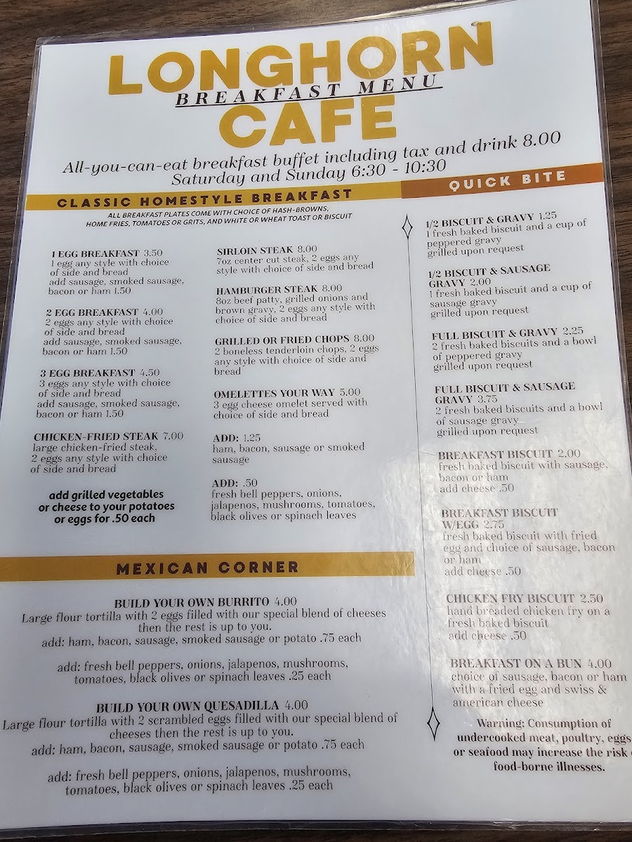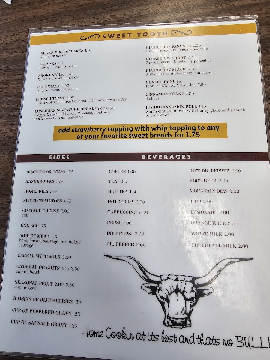 Beverage choices, from a robust coffee to refreshing lemonades and classic sodas, complement the meal seamlessly. The buffet stands out for its hot, homemade sides like corn and green beans—reminiscent of Sunday dinners at grandma’s house. Customer reviews praise the consistent quality, generous portions, and that unmistakable feeling of nostalgic, home-style meals. Longhorn Cafe truly delivers an honest, satisfying dining experience that keeps visitors coming back.