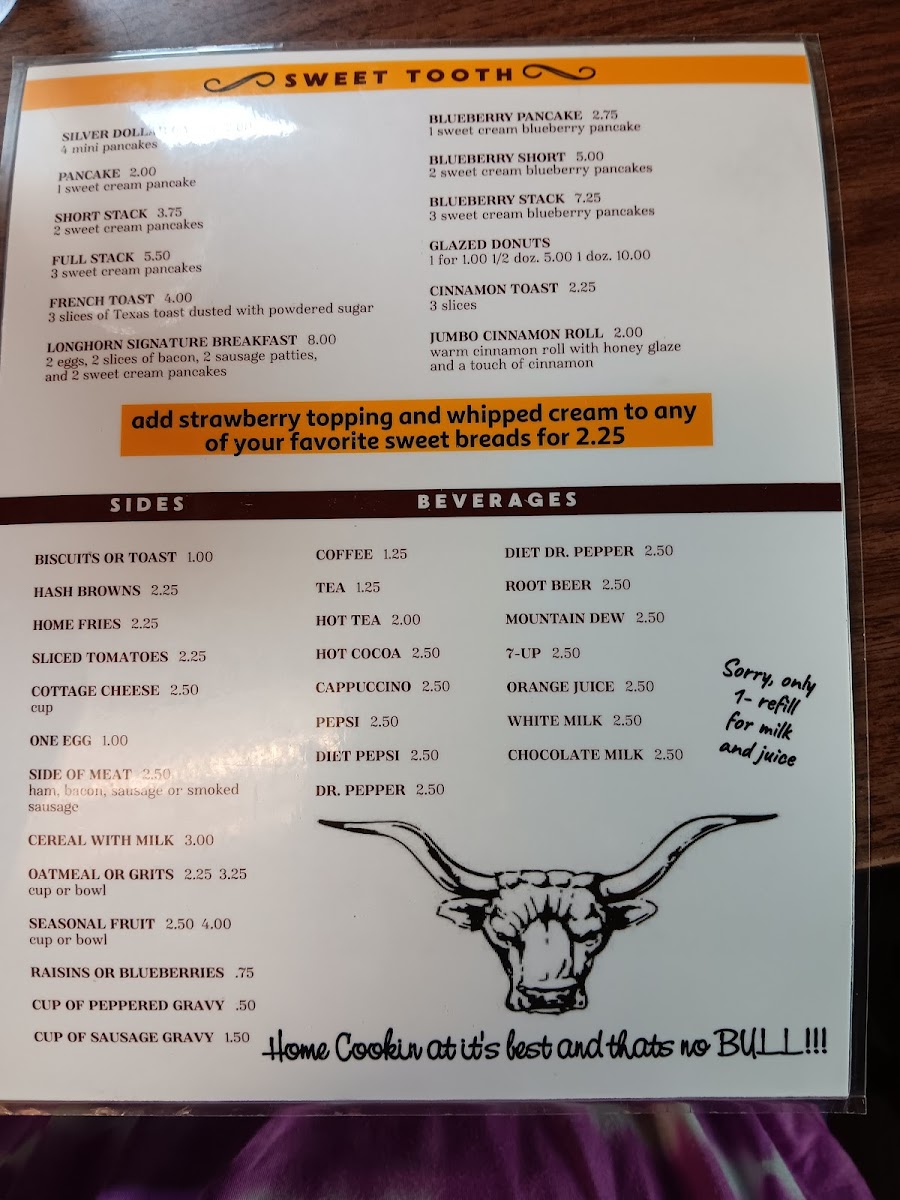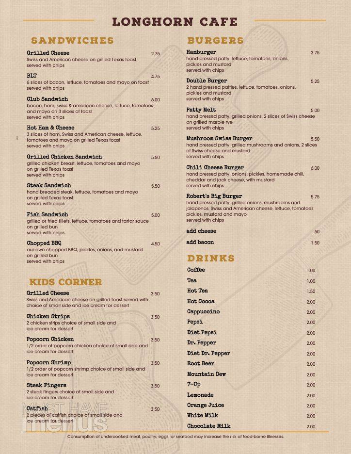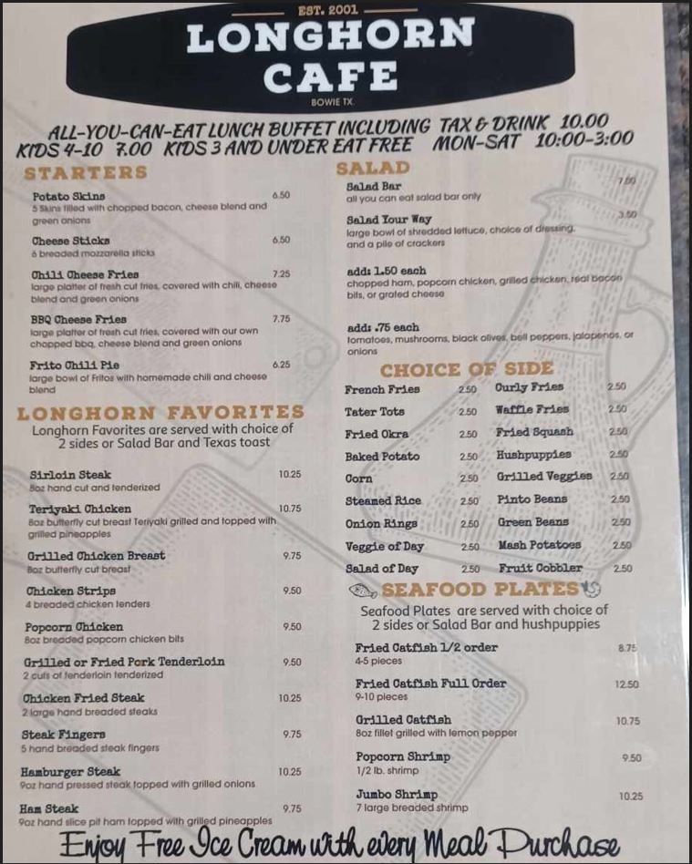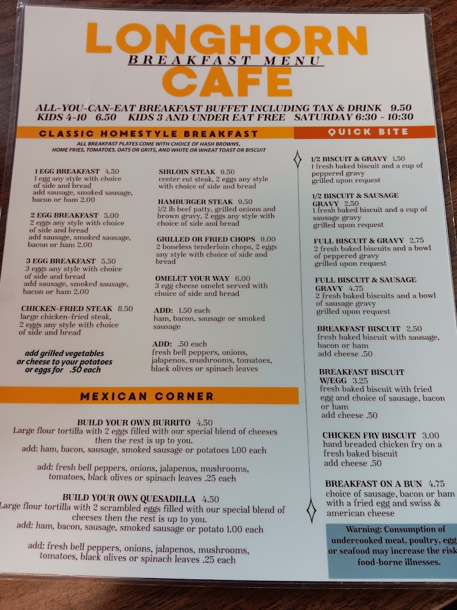 Beverage choices, from a robust coffee to refreshing lemonades and classic sodas, complement the meal seamlessly. The buffet stands out for its hot, homemade sides like corn and green beans—reminiscent of Sunday dinners at grandma’s house. Customer reviews praise the consistent quality, generous portions, and that unmistakable feeling of nostalgic, home-style meals. Longhorn Cafe truly delivers an honest, satisfying dining experience that keeps visitors coming back.